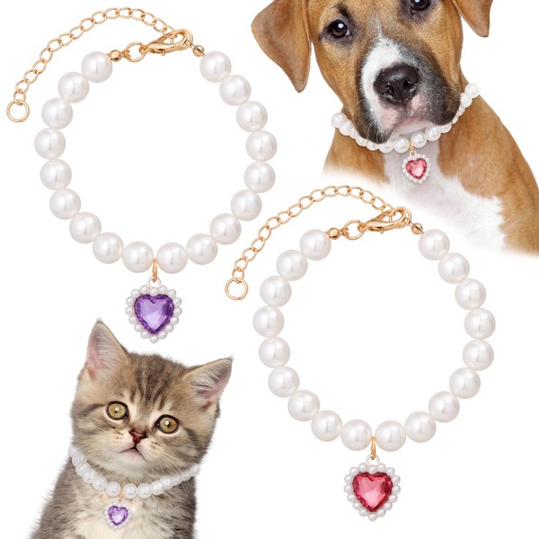 Pndeyo 2pcs Pearl Cat Collars, Adjustable Heart-Shaped Cat Necklace, Sparkly Rhinestone Pet Collar for Small Short Hair Puppy Kitten Rabbit Fox- Purple & Red