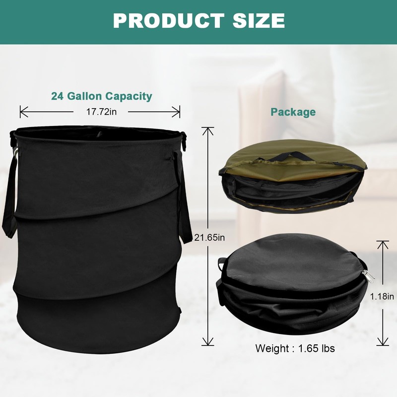 Perfect Size: Expand size: 17.7x17.7x21.6 inch (45x45x55 cm) Folded size: 18.9x18.9x1.2 inch (48x48x3 cm) Capacity: 24 Gallons/91L Color: Black、Green、Beige Product Usage: Can be used for camping life, clothes storage bag, garden/yard collecting garbage leaves, garage and home storage, etc Note: Collapsible trash can the dimensions are clearly marked, Please confirm the size, before buying buy according to your needs to prevent wrong shots.