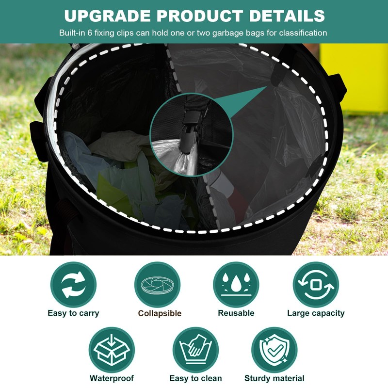 • Compact and Large Capacity: Our camping trash can is lightweight and holds up to 24 gallons to hold a large amount of items. Compact and easy to carry. There are two handles on the top of the container for easy handling and pouring. It can also be used as a folding trash can, with 6 built-in reinforced fixing clips, which can hang disposable bags inside the trash can, as well as clamp 2 bags at a time, making it easy to sort and store different items, making the environment tidier.