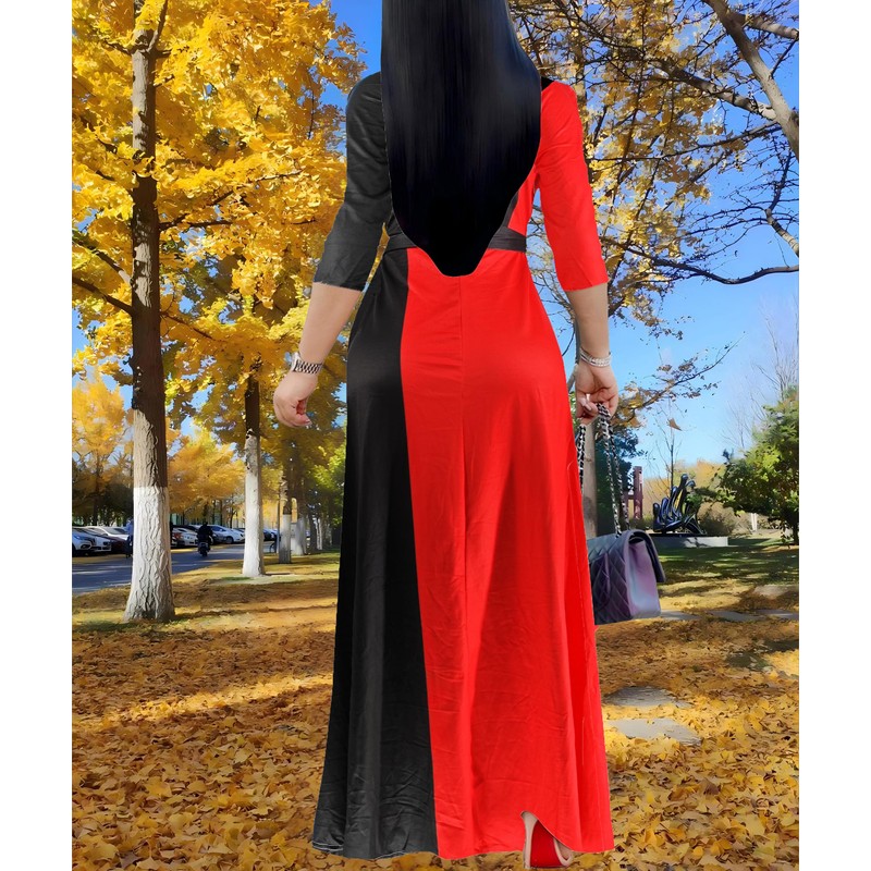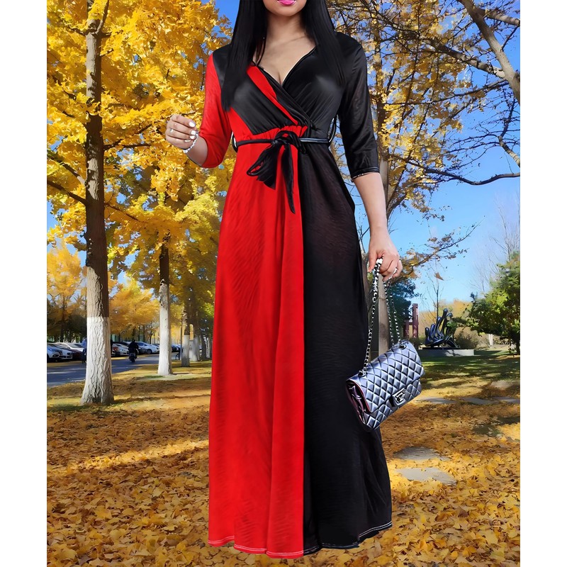 pnpednde Women's Plus Size Maxi Red Black Splice Print Long Casual Summer Sundress V-Neck 3/4 Sleeve with Belt Floral 182 X-Largel