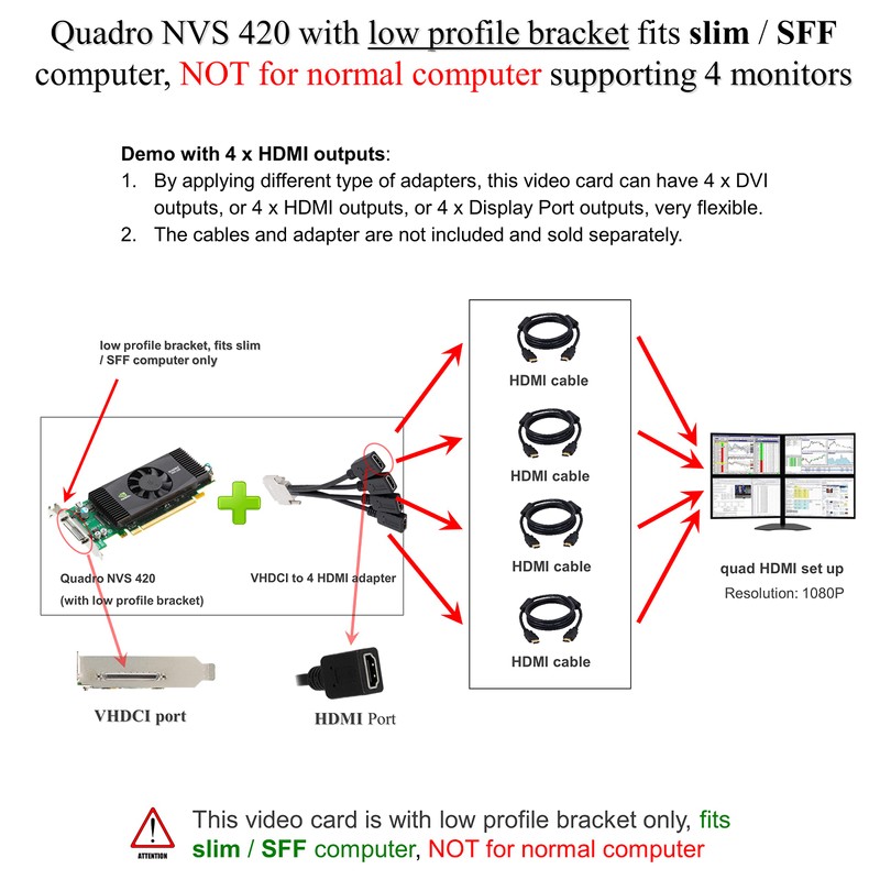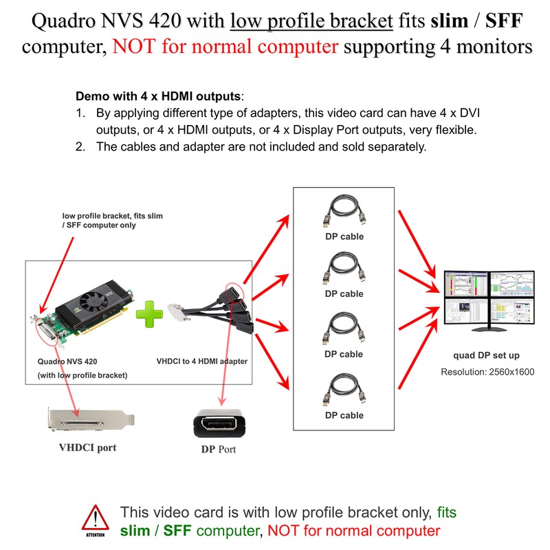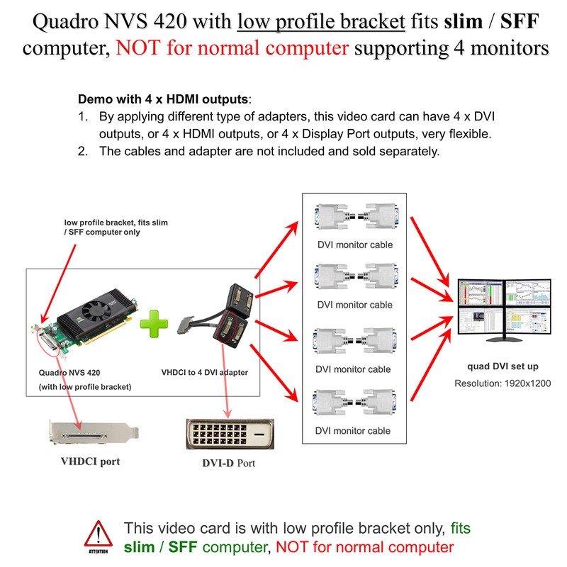 - This sell does not include that VHDCI to Quad DVI-D dongle, which is able to support 4 monitor with up to 1920x1200 resolution (Quad display port adapter is not included)