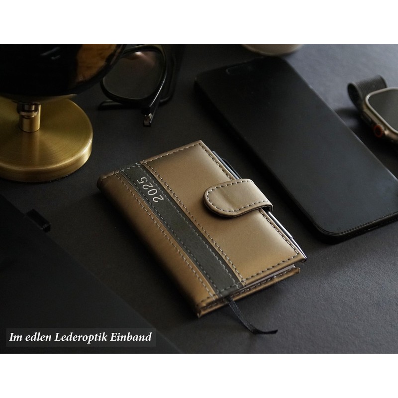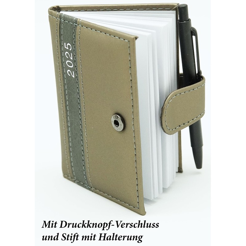 - 2024 Pocket calendar, with ballpoint pen: Elegant leather look. Pen holder and ribbon page marker. Stylish design and convenient to close with a push button.