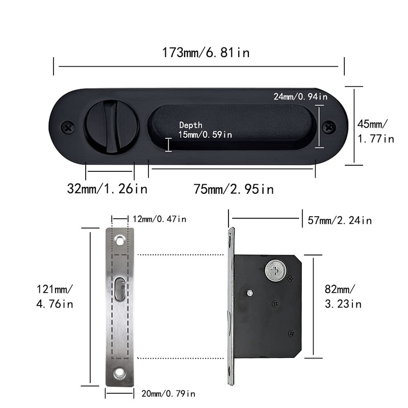 - 【SUITABLE FOR LEFT AND RIGHT DOORS】Pocket door lock length: 6-13/16", width: 1-3/4".width: 2-1/4". Suitable for 1-2/5" ~ 2" thickness door panels. Lock body length: 3-1/8", width: 2-1/4".thickness door panels. Sliding door lock suit well for most US standard door.