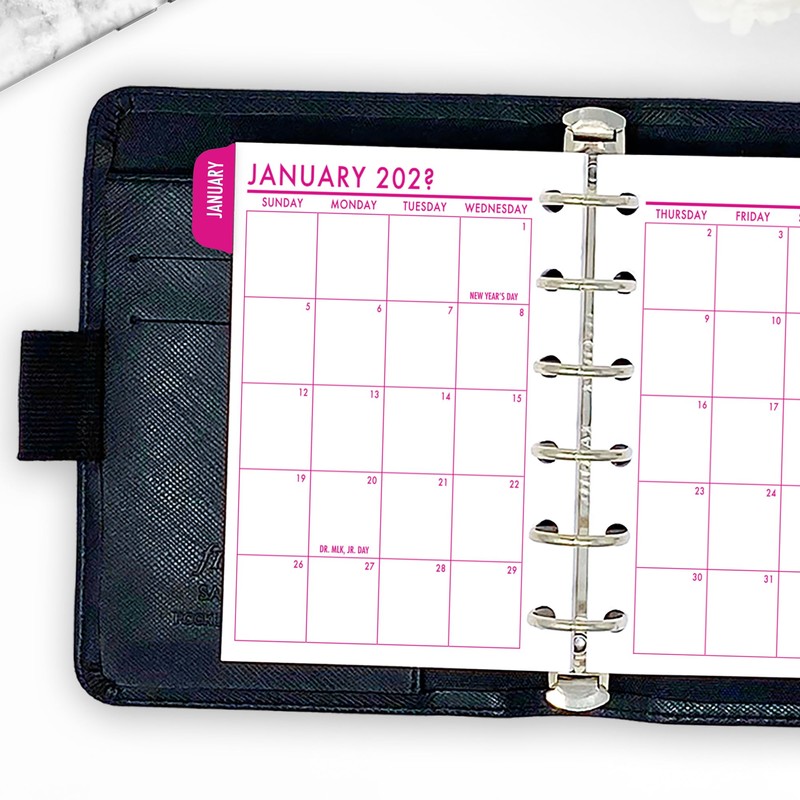 Pocket Fuchsia Flare Month on 2 Pages Tabbed Calendar Refill, 3.2 x 4.7, Sunday Start, Ring Binder Planner Insert, Dated Monthly View, Dark Pink Full Color Print, Choose 12 Months