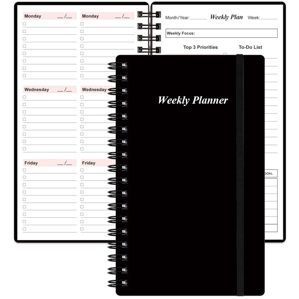 Pocket Weekly Planner - A6 Spiral Planner with 53 Sheets/ 106 Pages for Wallet/Purse, Last 1 Year, Inner Pocket, Elastic Closure, 3.75" x 6.75", Black