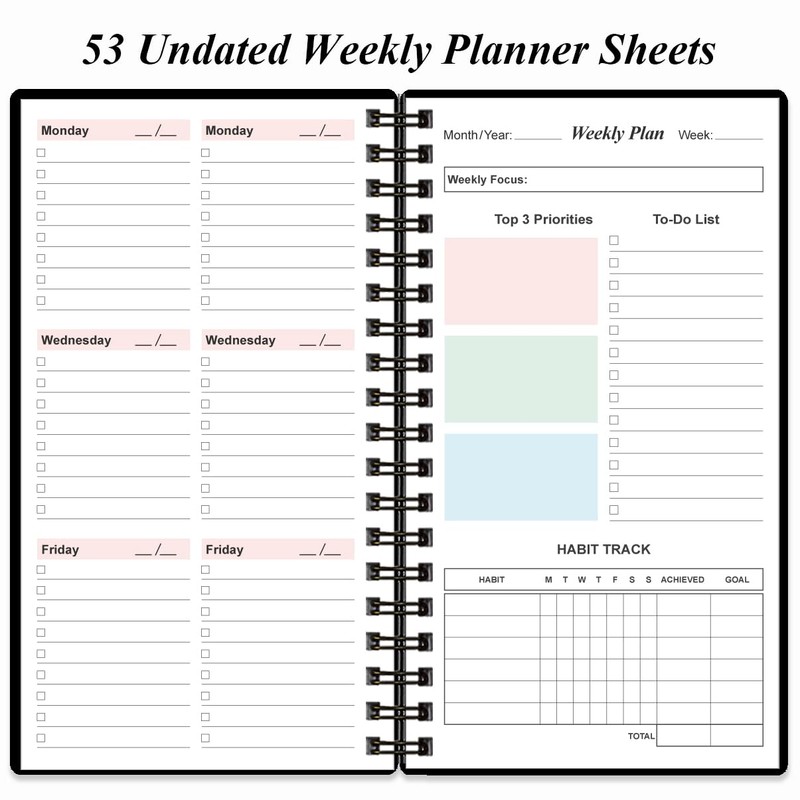 - WEEKLY - Planner with 53 sheets/106 pages for 1 yearly, improve your productivity with this daily organizer. Easy portability for daily use at work, home, school, or during travel