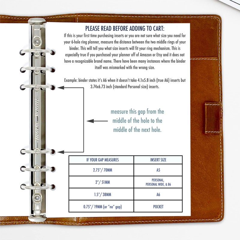 - [PUNCHED FOR 6-RINGS] 6 holes spaced 3/4" (19mm) to fit popular Pocket size planner binders by Filofax, LV PM, kikki K Small, Moterm and more. Check manufacturers insert refill sizing for compatibility if your binder wasn't mentioned here.