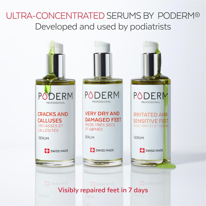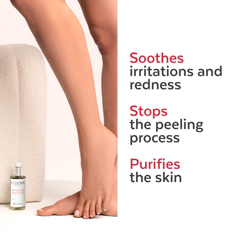 - ✅ CALMS REDNESS AND ITCHINESS : The PODERM Irritated and Sensitive Feet Serum soothes redness and calms itching for 24 hours. Additionally, it intensely nourishes dry areas and slows down the peeling process. Rediscover visibly repaired feet in 7 days.