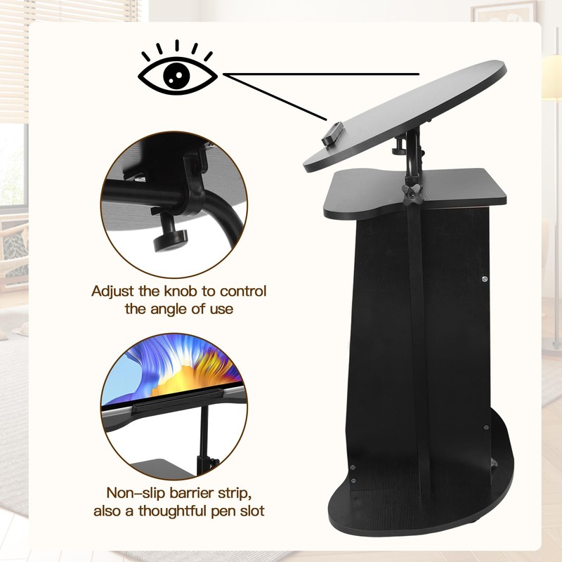 0-180° Adjustable Tilting Tabletop--The lectern podium stand features a tiltable tabletop that offers a comfortable viewing angle for you to deliver a speech, read a book or work on the laptop. You can adjust the tabletop angle between 0°-180° (45° is recommended). And there is an edge stopper to prevent items from falling off.