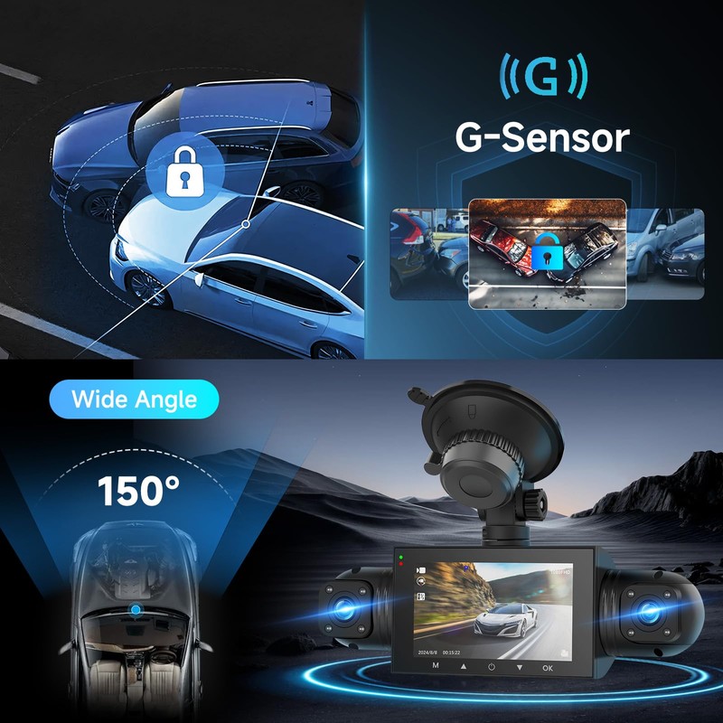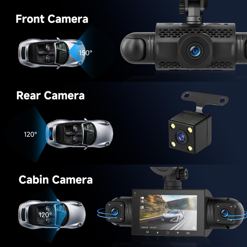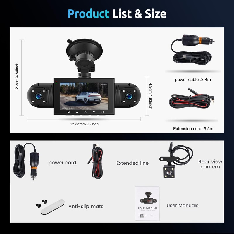 • 4-channel 360° dash cam: 4-channel dash cam with 3-inch screen, supports 2 front/rear and 2 in-vehicle camera feeds, left and right cameras can be manually rotated to adjust the angle. Front camera is HD 1080p, the other three cameras are 480p definition.