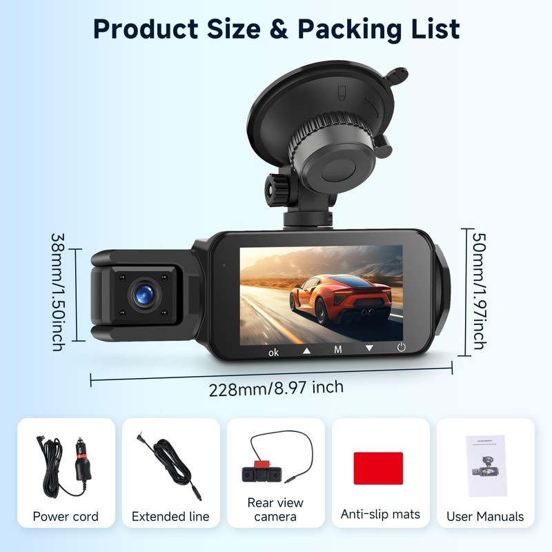 - Easy installation: simply attach the dash cam to the windscreen with the suction cup, attach the rear view camera to the back of the vehicle and connect the two via the wiring harness. It is ready to use.