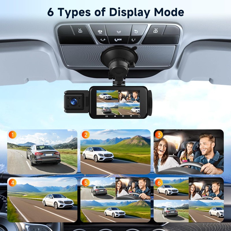 - [4-channel dash cam] - The 4-channel dash cam has a 3-inch screen, a front camera, a vehicle camera and two rear cameras. The angle can be rotated manually. The front camera offers HD 2K, the other three cameras a resolution of 1080p.