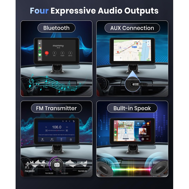 - 5.Upgrade Dual Bluetooth: Upgraded BT audio output options for this car play screen allows you to directly connect to your car's bluetooth to emit the sound of carplay and android auto to the car's own speakers, enjoying the best and the most stable and high-quality stereo sound through the original car audio system. You can also use AUX connection, FM Transmitter, and the built-in speaker to get audio