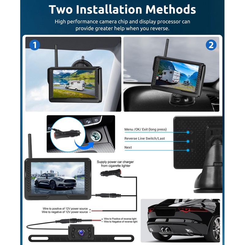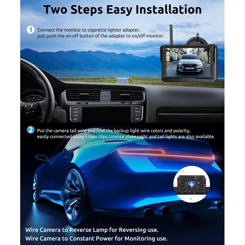 - Easily and Quickly Installation: The rear view camera and car monitor both have built-in wireless modules, eliminating the need for wired connections. Simply connect the monitor to the cigarette lighter and connect the truck's rearview camera to the brake light or license plate for rearview or reverse operations