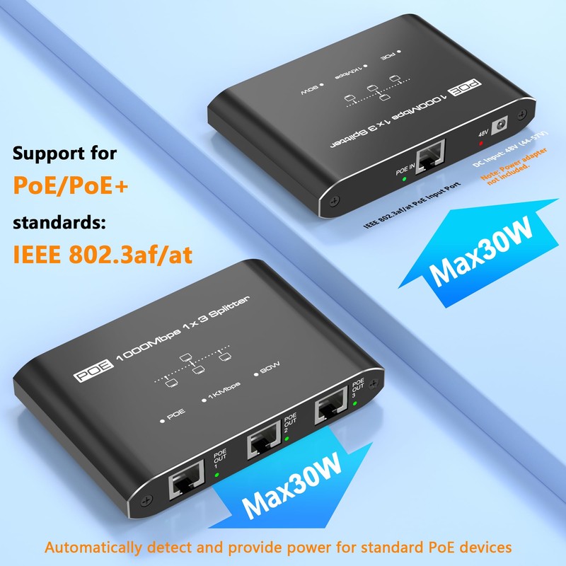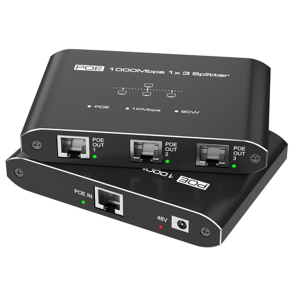 This 1-to-3 Gigabit PoE Splitter is a high-performance Power over Ethernet (PoE/PoE+) network hub designed to expand your network connectivity while delivering both data and power (up to 30W per port) through a single Ethernet cable. Fully compliant with IEEE 802.3at/af standards, it acts as both a PoE passthrough switch and Ethernet splitter, allowing you to connect 3 PoE-powered devices (such as IP cameras, wireless access points, or VoIP phones) from a single PoE switch port.
