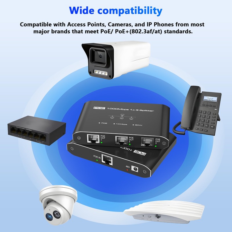 • 【3 Port Gigabit PoE Switch】Transform a single PoE switch port into three independent outputs with full Gigabit speed (10/100/1000Mbps). Delivers ≤30W per port to power IP cameras, wireless APs, and VoIP phones simultaneously – ideal for expanding networks without additional wiring or switch investments.