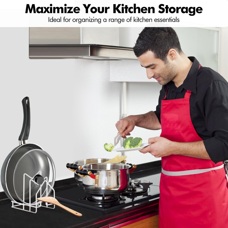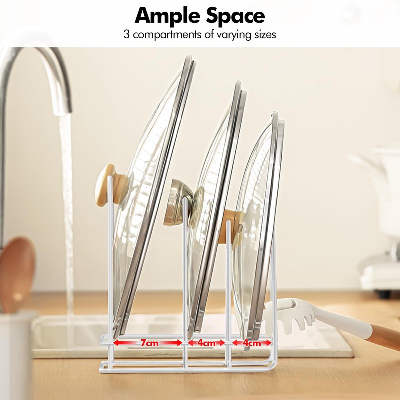 • Ample Space - Measuring 6.8" x 7.8" x 4.9", our bakeware rack features 3 compartments of varying sizes to store different sizes of lids at the same time