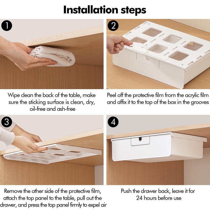 Upgrade Your Desk Organization with Our Sleek Under-Desk DrawerOur under-desk storage drawer is the perfect solution for keeping your essentials tidy and within easy reach.Designed to install seamlessly beneath most desks, it features an invisible handle and a built-in stopper to prevent accidental detachment, ensuring a sleek and secure fit.The spacious main drawer includes a small inner drawer, ideal for sorting small items like pens, rulers, phones, headphones, and more.Crafted from sturdy PP and PS materials, this drawer is wear-resistant and built to last.Comes with strong adhesive for quick mounting on smooth, flat surfaces.(Note: Not suitable for tables with raised crossbars)Specification:Material: PP, PSColor: Off whiteWhole product size: 13.9" x 9.8" x 3.9" (35.3 x 25 x 10 cm)Drawer interior size: 12.6" x 9" x 3.2" (32 x 23 x 8.3 cm)Small drawer interior size: 8.1" x 3.8" x 1.1" (20.5 x 9.6 x 2.9 cm)Load bearing: 6.6lbs/3kgPackage includes:1 x Under Desk Drawer Organizer4 x Adhesive TapeCAUTION!1. The load bearing of this product is no more than 6.6 lbs., please do not place heavy objects.2. When you finish the installation, let sit for 24 hours before using.3. Only suitable for installation on a flat, smooth under-table surface with sufficient space (> L15*W11*H5.5 inch), not suitable for tables with raised crossbars. Please measure the size of the space under the desk before buying to make sure it can fit.