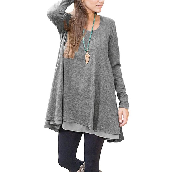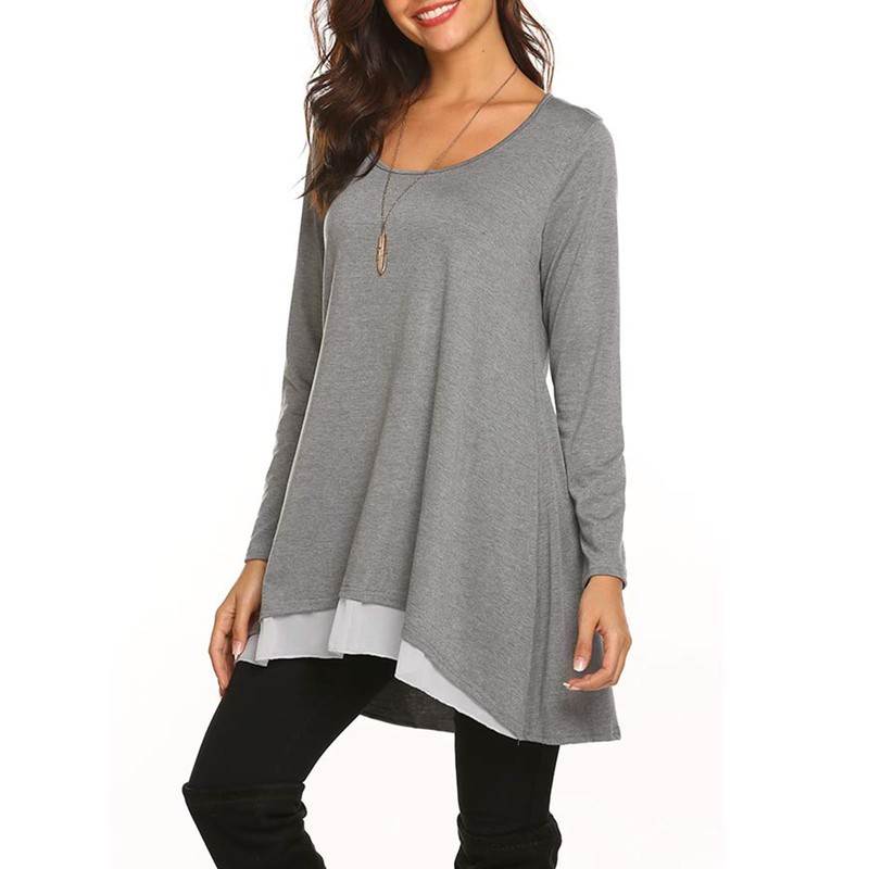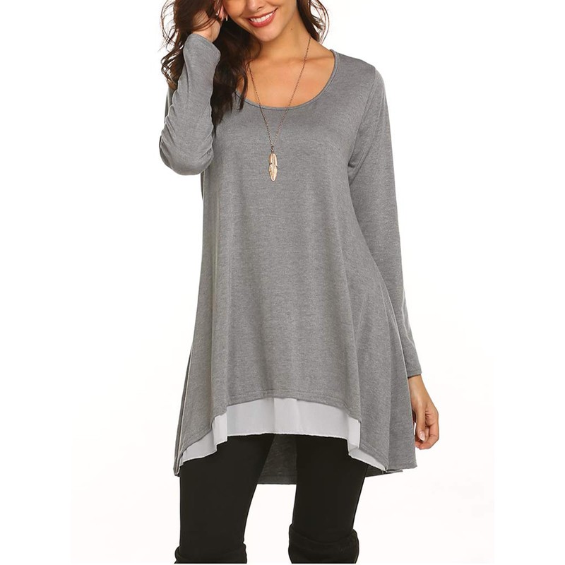 • Designs: This casual top is of good quality, crew neck and long sleeve keep you warm, A line shape is very forgiving and covers the belly, high-low chiffon hem and right length cover the hips perfectly when wearing leggings.
