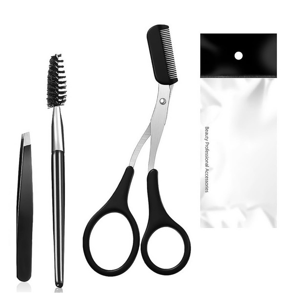 - The package includes: 1 x eyebrow scissors with comb, 1 x brush, 1 x tweezers.