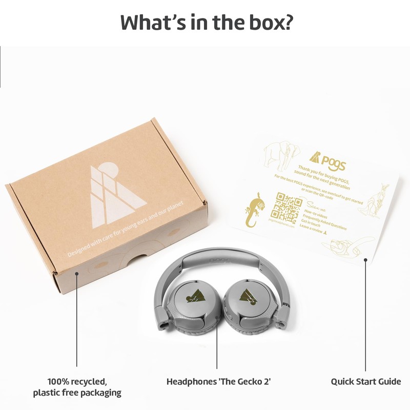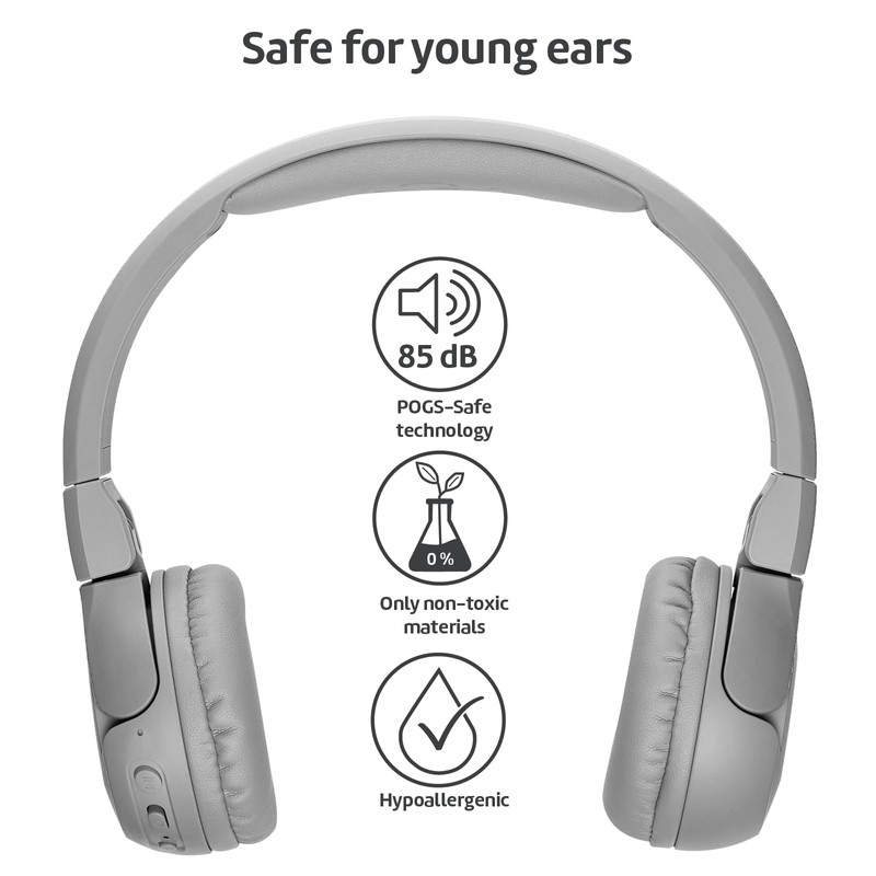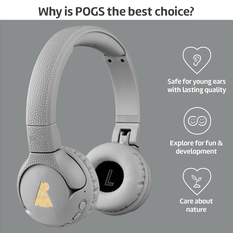 POGS Bluetooth wireless kids headphones | The Gecko 2 | Adjustable, foldable, durable headphones for kids 3+ | Volume limited 85 dB | Microphone | On-Ear | Wireless music-sharing function (rGrey)
