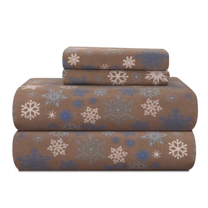 Pointehaven Heavy Weight Printed Flannel Sheet Set, Full, Snow Flakes/Tan