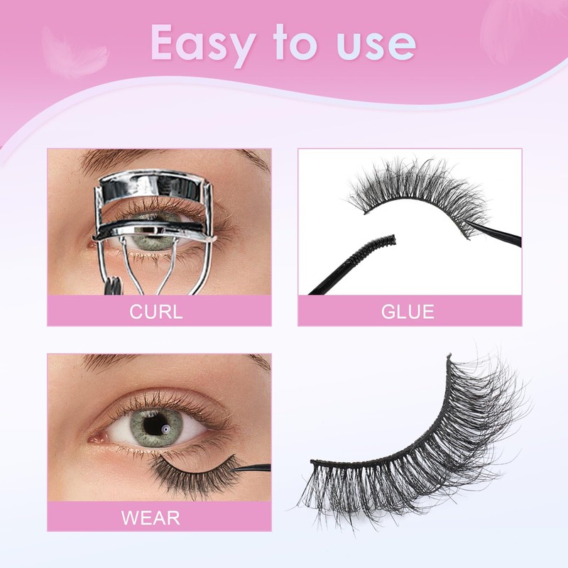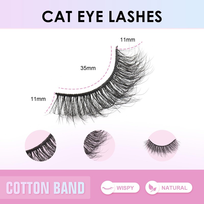 - 【☘ How to use】First, curl your own lashes. The second step is to apply eyelash glue to the cat eye lash bands and then place strip lashes on the eyes.