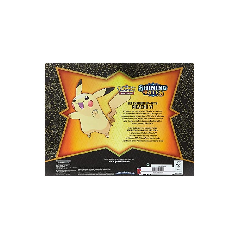 The Pokémon TCG: Shining Fates Collection—Pikachu V includes: 1 foil promo card featuring Pikachu V 1 foil oversize card featuring Pikachu V 4 Pokémon TCG: Shining Fates booster packs A code card for the Pokémon Trading Card Gam e Online