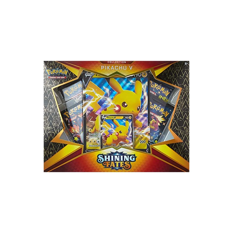 The Pokémon TCG: Shining Fates Collection—Pikachu V includes: 1 foil promo card featuring Pikachu V 1 foil oversize card featuring Pikachu V 4 Pokémon TCG: Shining Fates booster packs A code card for the Pokémon Trading Card Gam e Online