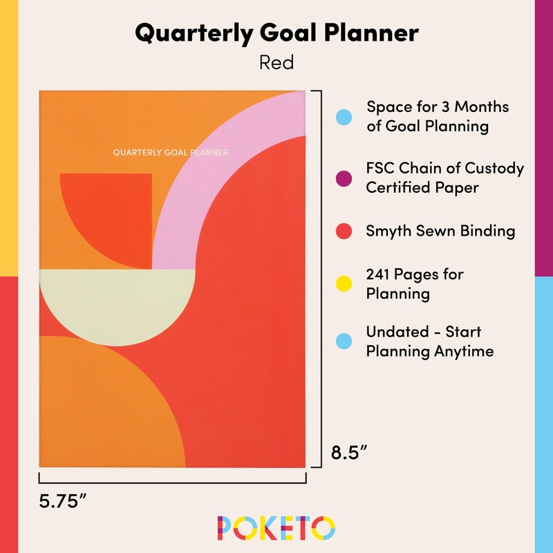 POKETO - Quarterly Goal Planner, 8.5" (Red) - 3 Months of Planning - Undated Planner - Monthly, Weekly, & Daily Goal Setting - Guided Journal - To Do List - Self Care & Wellness - 241 Open Pages