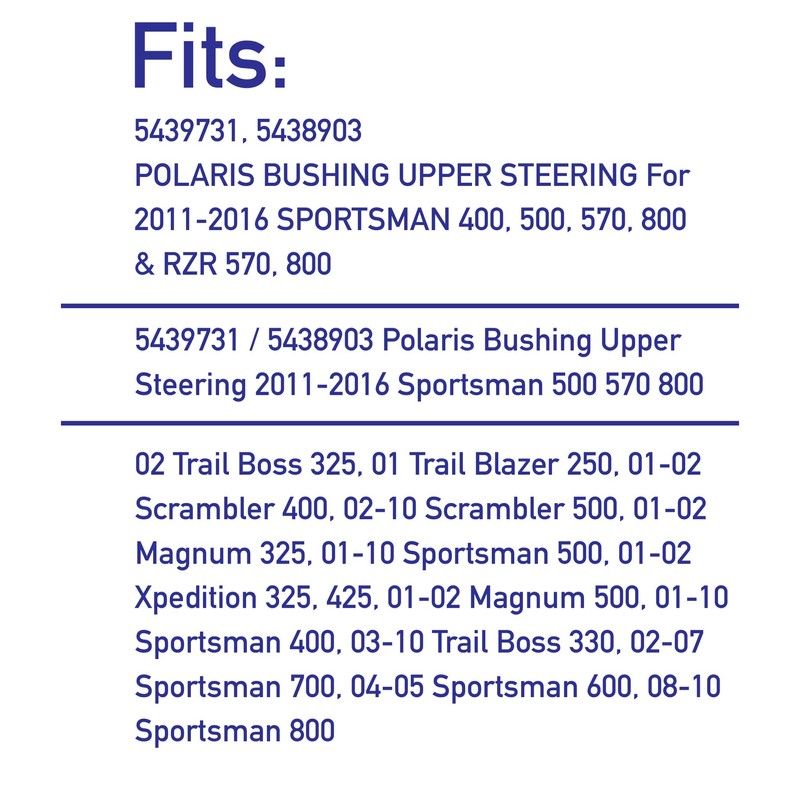 These upper steering bushing sets are direct replacements for part numbers 5438903 and 5439731. It means that they are perfect fits for the following Polaris models:
