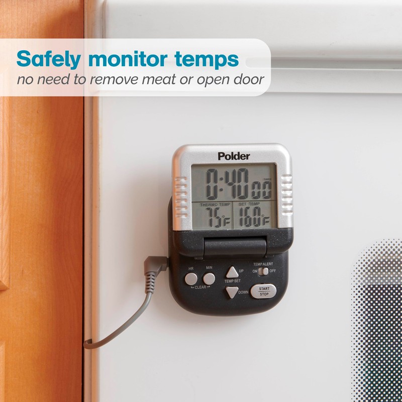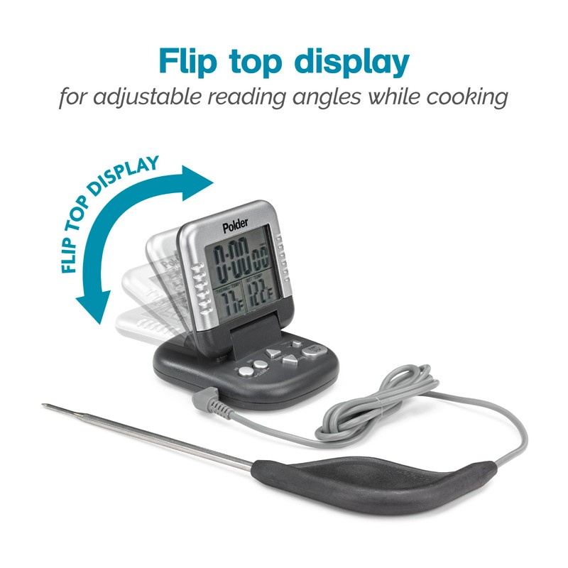 Polder Classic Digital Thermometer and Timer, Meat Thermometer for Cooking, Stainless Steel Probe, 24-Hour Countdown Timer with 40" Long, High-Heat Silicone Cord