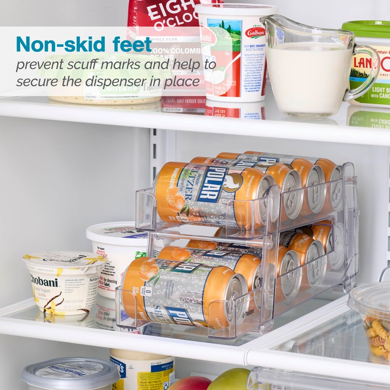- FRIDGE ORGANIZER: Keep your fridge neat and your favorite beverages easily accessible with our can dispenser. The gravity-fed system, supported by silicone guides, ensures seamless replenishment as the cans roll forward smoothly as they move downward