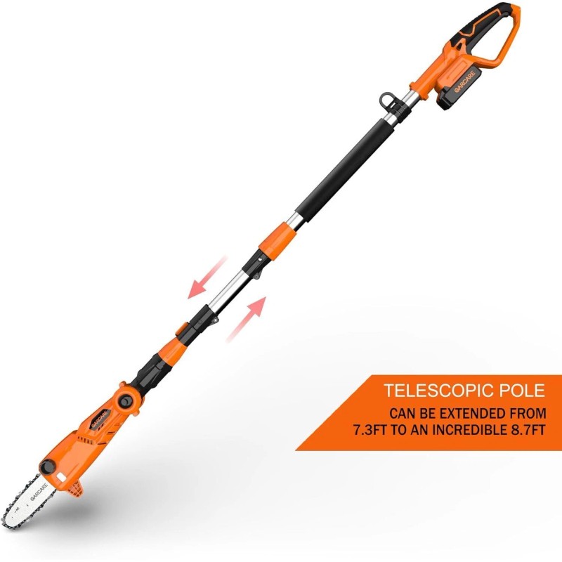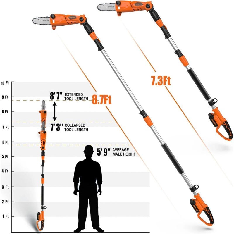 【With Telescopic Pole】This power chain saw with poles can be extended from 7.3ft to 8.7ft, and the telescopic pole structure can be used for different heights and occasions.