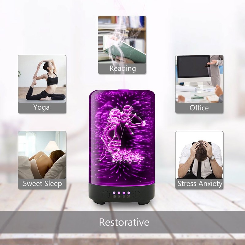 - Restorative: Using this 3D glass oil diffuser humidifier, banish lingering unpleasant odors, and moisturize the air for softer skin with cool mist humidity and diffused essential oils