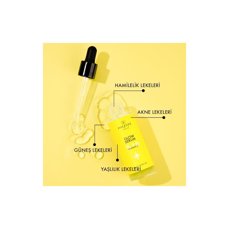- Glow Serum, yüksek oranda C vitamini (%10) içeriği ile cilt lekeleri üzerinde etkinlik gösteren doğal kaynaklı, su bazlı formülasyona sahiptir.