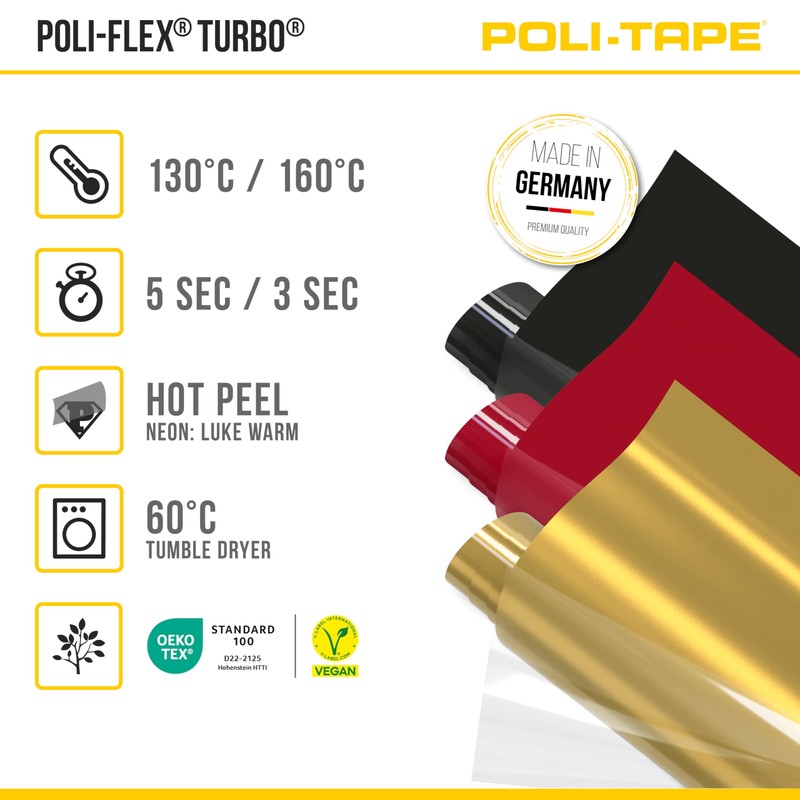 - The turbo-fast transfer film: Poli-flex Turbo is a high-quality flex film made in Germany. It is suitable for transferring text onto textiles quickly and gently.