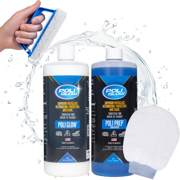 - THE POLI GLOW KIT INCLUDES: One 32 ounce bottle of Poli Prep, One 32 ounce bottle of Poli Glow, 1 microfiber mitt applicator, 1 white scrub pad with handle, and 1 pair of gloves