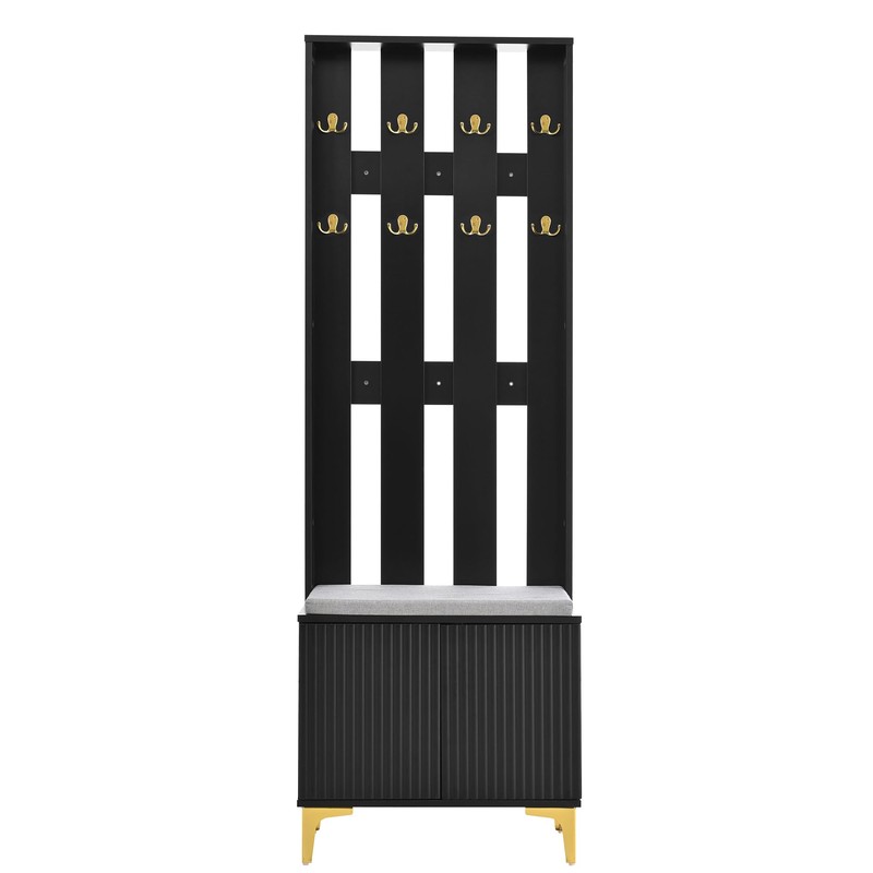 Polibi Modern Versatile 4-in-1 Hall Tree with Cushion,Luxury Coat Rack with 8 Gold Hooks and Legs,Entryway Bench with Adjustable Shelves & Fluted Doors for Hallway,Living Room,Black(23.6"*70.8")