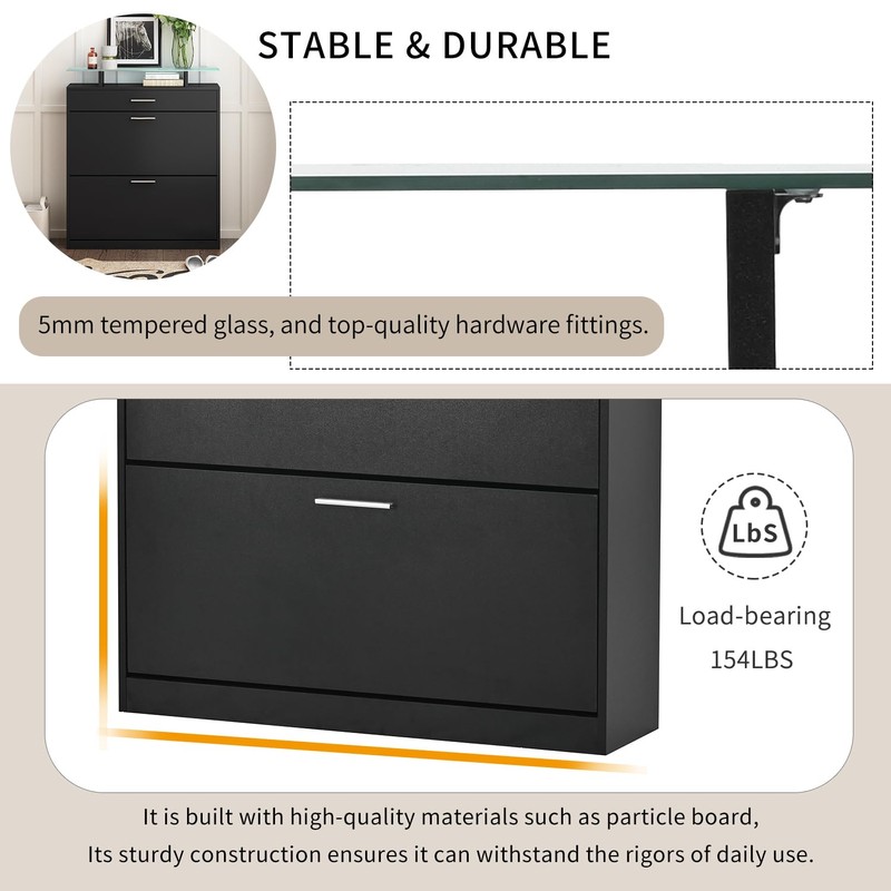 - [Large Storage Drawers] The two flap drawers are practical for up to 16 pairs of shoes. It also includes a handy drawer with extra space for accessories like shoe polish or extra laces. The glass top is also a great place to display decorations.