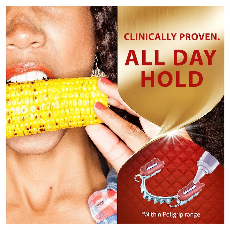 Poligrip Power Hold + Seal Denture Adhesive Cream gives your dentures a strong all day hold 12hr hold with 5x the protective food seal*. Even well-fitting dentures are susceptible to food particles that can cause discomfort and gum irritation. This Poligrip denture adhesive cream features a precision nozzle that enables the denture cream to deliver an all around seal to help keep food from getting stuck under your dentures. This denture adhesive is formulated to be flavor free. Just apply a small amount of dental adhesive to clean, dry, well-fitting dentures once daily as part of your dental care routine for 12 hour hold. Poligrip Power Hold & Seal dental adhesive creates a layer between your dentures and gums for a comfortable fit and strong, all day hold, allowing you to eat, speak and smile with confidence. *vs no adhesive.