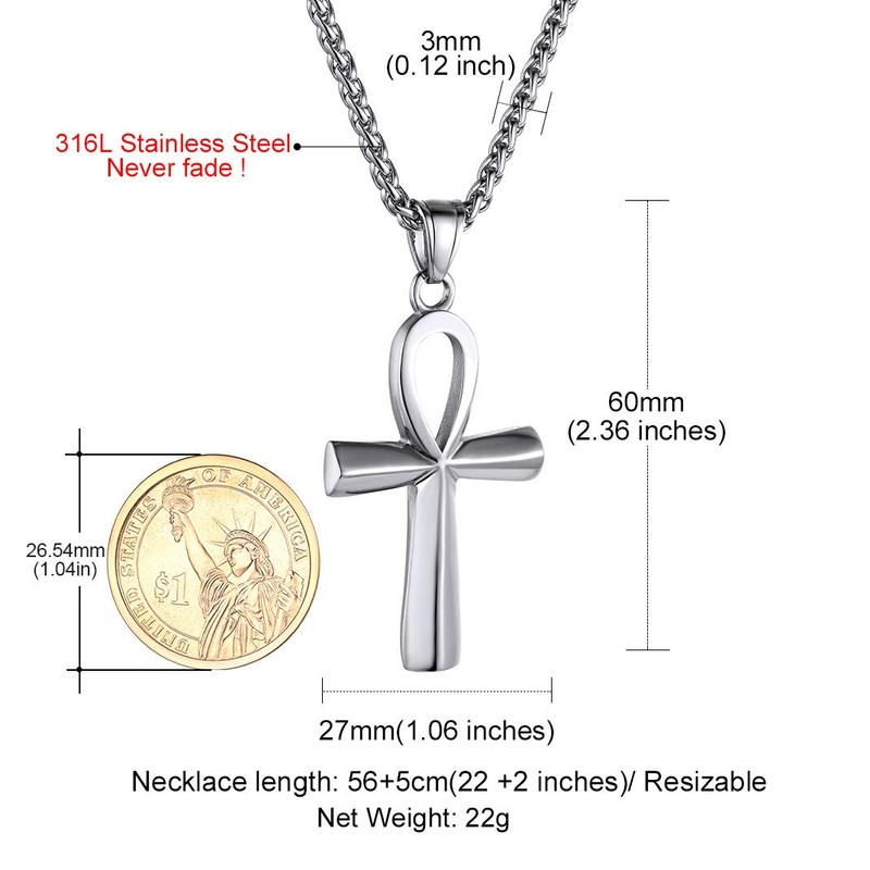 - MEASUREMENT: Pendant size 60mm*27mm, with 22" Stainless Steel Chain (2” extender ). Sturdy and durable. This ankh Pendant Necklace is available in three colorways; 18K Gold plated, 316L Stainless Steel and Black Platinum.