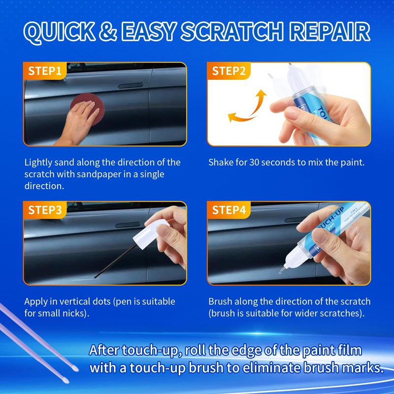 - Quick and Easy Quick-Drying: Get car scratch repairs in minutes with our 60-second touch-dry formula (full cure in 2 hours at 20°C). Just 3 simple steps for professional-looking results.
