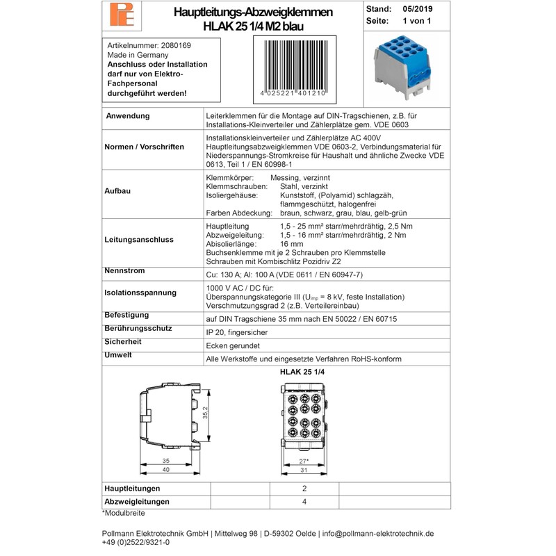 - 6 clamping points: 2 x max. 25 mm² and 4 x max. 16 mm²
