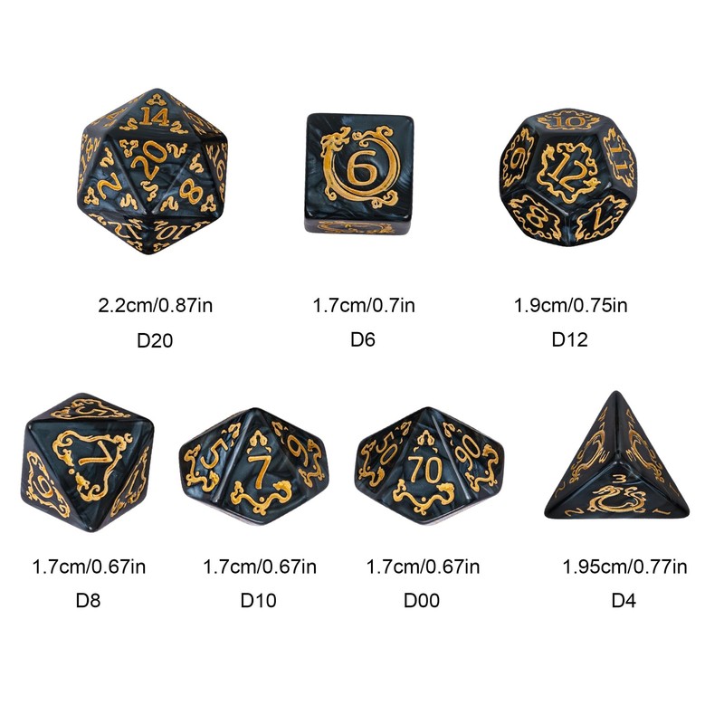 - 7-Die DND Dice: This full dice set including 1*D4, 1*D6, 1*D8, 1*D10(0-9), 1*D12, 1*D20 and 1*D%(00-90) totally 7 Pieces. You will get a leather drawstring dice bag to storage it.