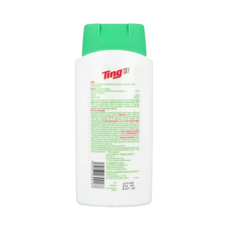 Polvo Ting Antimicótico para Pie de Atleta es tu aliado perfecto para mantener tus pies frescos y saludables. Con una formulación poderosa que incluye ácido undecilénico, undecilenato de zinc y triclosan, este producto no solo combate los hongos sino que también elimina las bacterias que causan el mal olor. 🌿💪