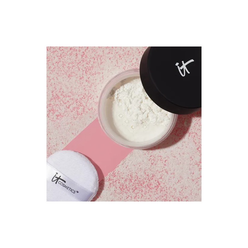 CÓMO APLICAR - Barre una pequeña cantidad de polvo translúcido suelto sobre la piel con su pincel de maquillaje favorito de IT Cosmetics.