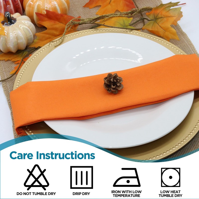 - WASHABLE & EASY TO MAINTAIN: These soft polyester napkins are machine washable, dryer-compatible, & designed to minimize stains and spills. Their wrinkle-free fabric provides low-maintenance, long-lasting decor for dining tables, events, & rentals.