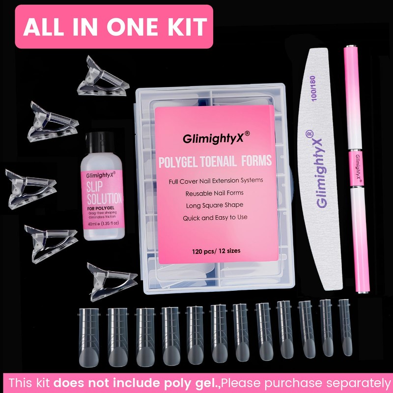 - SQUARE TOENAILS FORM KIT: The GlimightyX Polygel Toe Nail Forms Kit offers pre-shaped square styles with long lengths, allowing you to achieve an elegant square-shaped pedicure at home in just 15 minutes. This kit includes 120 dual nail forms, a dual-ended brush, and 5 nail clips, making it easier and more convenient to use the dual polygel nail forms for a flawless pedicure