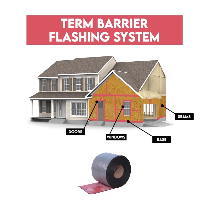 - TERM Flashing | Termite Barrier is applied where the horizontal concrete slab intersects with exterior sheathing. This area is a frequent entry point for termites that have come up on the outside of the foundation wall.